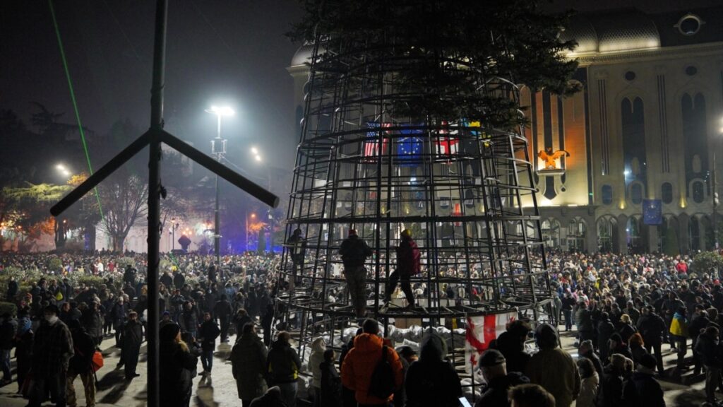 ნაძვისხეს მერია აწყოვს იმ ადგილზე, სადაც უკვე მეთერთმეტე დღეა არ წყდება ათასობით ადამიანის პროტესტი – მოქალაქეები აპროტესტებენ მმართველ პარტიაში მიღებულ გადაწყვეტილებას, რომლის მიხედვითაც ხელისუფლება 2028 წლის ბოლომდე დღის წესრიგში არ დააყენებს ევროკავშირთან წევრობაზე მოლაპარაკების გახსნის საკითხს.