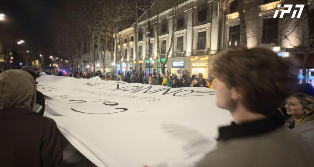 შოთა რუსთაველის სახელობის თეატრისა და კინოს უნივერსიტეტთან შეკრებილები ბანერით “ტირანიის წინააღმდეგ” პარლამენტისკენ მსვლელობით მიდიან.