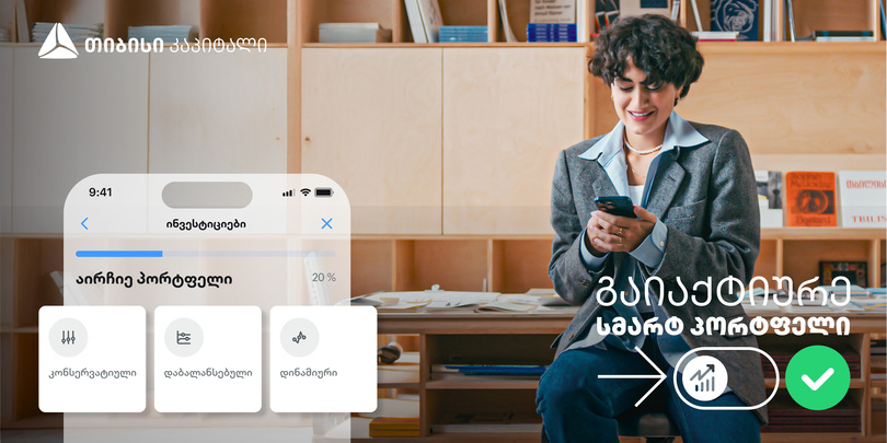 განაახლე თიბისის მობაილბანკის აპლიკაცია. შენი მიზნებისა და რისკიანობის დასადგენად, საინვესტიციო პლატფორმაზე შეავსე მარტივი კითხვარი. პასუხების მიხედვით განისაზღვრება რომელია შენთვის რეკომენდებული სმარტ პორტფელი – კონსერვატიული, დაბალანსებული, თუ დინამიური.