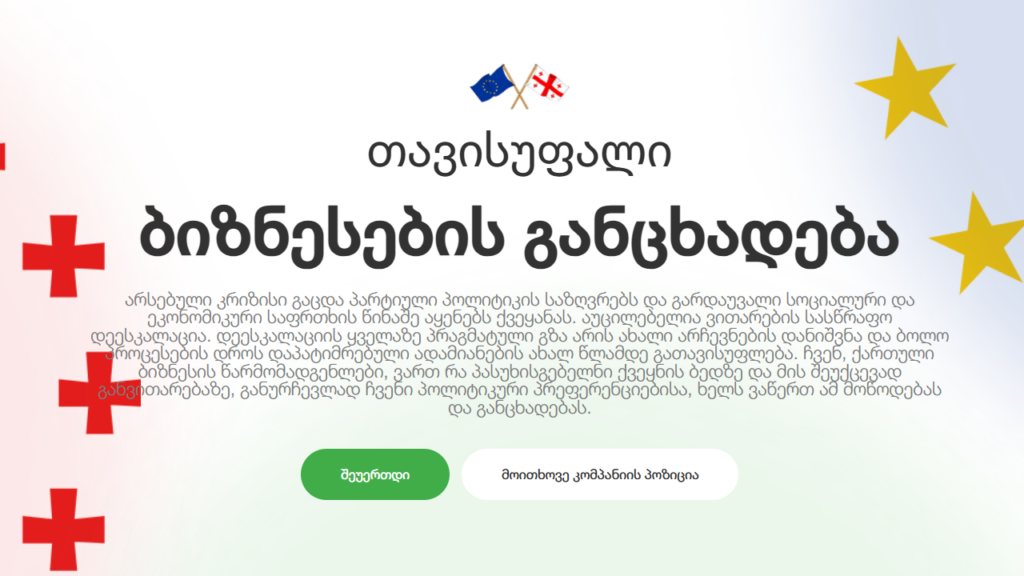 განცხადების ხელმომწერთა შორის არიან „მაგთი“, ჯიპიაი ჰოლდინგი • GPI Holding, კლინიკა კურაციო, სავაჭრო ცენტრი ქარვასლა, ბარამბო და სხვა კომპანიები.