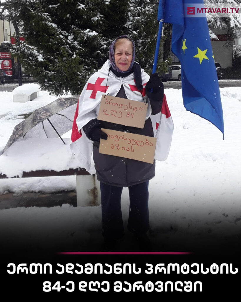 “თოვლიანი მარტვილიდან, უწყვეტი პროტესტის 84-ე დღე, მზისა გაბეშია…”  – წერს Mariam Kikalishvili ჯგუფ “დაიტოვეში” და ფოტოს აქვეყნებს.