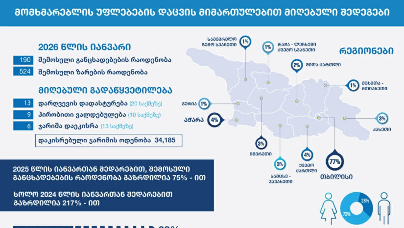 მომხმარებლის უფლებების დაცვის მიმართულებით, მიმდინარე წლის იანვარში, GCCA-ში – 190 განაცხადი დაფიქსირდა, ხოლო შემოსული ზარების რაოდენობამ 524 შეადგინა. შემოსული განცხადებების რაოდენობა, გასული წლის ანალოგიურ პერიოდთან შედარებით, 75 %-ით, ხოლო 2024 წლის ანალოგიურ პერიოდთან შედარებით – 217 %-ით არის გაზრდილი.