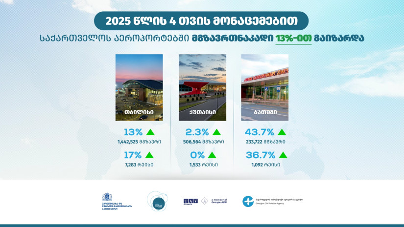 თბილისის შოთა რუსთაველის სახელობის საერთაშორისო აეროპორტმა 2025 წლის ოთხ თვეში – 1,442,525 მგზავრი და 7,283 რეისი მიიღო, რაც გასული წლის პირველ 4 თვესთან შედარებით, მგზავრთნაკადის 13%-იან ზრდასა (2024წლის 4 თვე – 1,278,447 მგზავრი) და რეისების 17%-იანზრდას წარმოადგენს (2024 წლის 4 თვე – 6,235 რეისი).