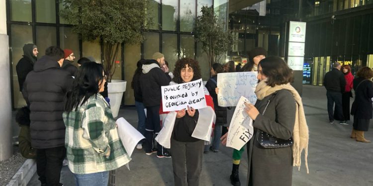 “ძვირფასო საჯარო რეესტრო, ქვეყანაში საჭიროა ცვლილებების რეგისტრაცია” – წერია ბანერებზე.