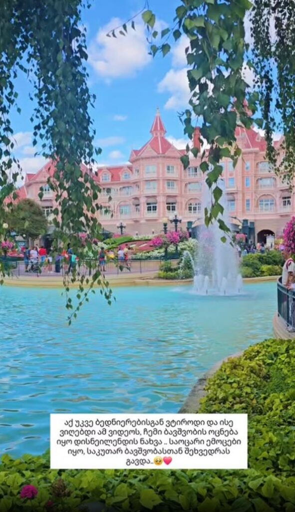 “ჩემი ბავშვობის ოცნება იყო დისნეილენდის ნახვა, საოცარი ემოციები იყო, საკუთარ ბავშვობასთან შეხვედრას ჰგავდა… ჩემს დაკარგულ ფეხსაცმელსაც მოვაგენი. ხშირად შემხვედრია კომენტარები, როცა კონკიას მადარებენ. ზოგი განიცდის და მიცავს, ჰგონიათ, რომ ეს დამამცირებელია. ჩემთვის კი კონკია სიძლიერესთან, მოშურნეობის პატიებასთან, სიკეთით ბოროტების დამარცხებასთან ასოცირდება, ამიტომ, იცოდეთ, რომ არ მწყინს, როცა მადარებთ, პირიქით…