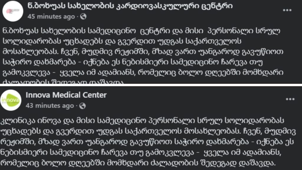 „კლინიკა ინოვა და მისი სამედიცინო პერსონალი სრულ სოლიდარობას უცხადებს და გვერდით უდგას საქართველოს მოსახლეობას. ჩვენ, მუდმივ რეჟიმში, მზად ვართ უანგაროდ გავუწიოთ საჭირო დახმარება – იქნება ეს ნებისმიერი სამედიცინო ჩარევა თუ გამოკვლევა – ყველა იმ ადამიანს, რომელიც ბოლო დღეებში მომხდარი ძალადობის შედეგად დაშავდა“, — წერს სამედიცინო ცენტრი Innova.