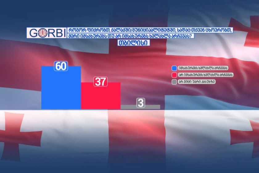 კითხვაზე, როგორ ფიქრობთ, ქალაქში/მუნიციპალიტეტში, სადაც თქვენ ცხოვრობთ, მერი იმსახურებს თუ არ იმსახურებს ხელახლა არჩევას, – „გორბის“ მიერ ჩატარებული საზოგადოებრივი აზრის კვლევის მიხედვით, თბილისში გამოკითხულთა 60%-მა განაცხადა, რომ იმსახურებს ხელახლა არჩევას.