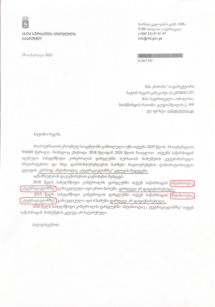 რაც შეეხება ანტიბიოტიკებს, პროდუქცია პერიოდულად მოწმდება ანტიბიოტიკების კვალზე სეს-ის მიერ და სრულიად სუფთაა.