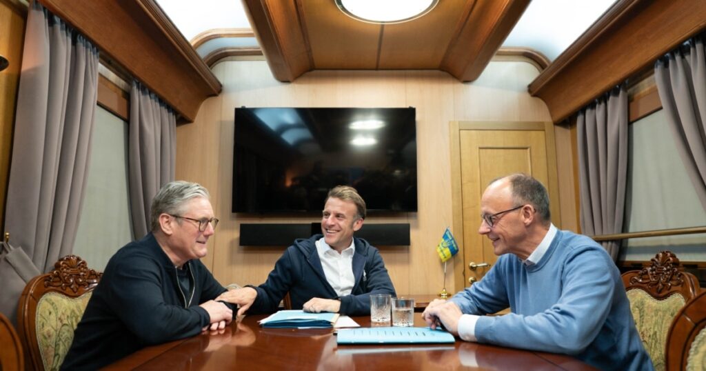 გერმანიის კანცლერი ფრიდრიხ მერცი, საფრანგეთის პრეზიდენტი ემანუელ მაკრონი და დიდი ბრიტანეთის პრემიერ-მინისტრი კირ სტარმერი კიევში “მსურველთა კოალიციის” შეხვედრაზე მატარებლით ერთად ჩავიდნენ.