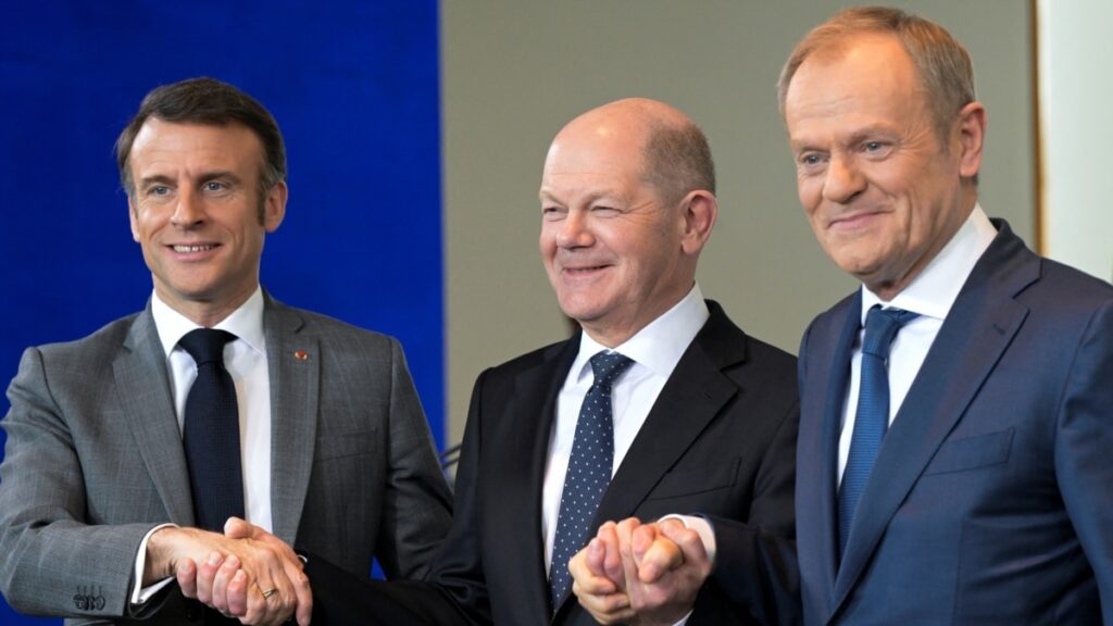 საფრანგეთის პრეზიდენტი ემანუელ მაკრონი, გერმანიის კანცლერი ოლაფ შოლცი და პოლონეთის პრემიერ-მინისტრი დონალდ ტუსკი ერთობლივ განცხადებაში საქართველოში არსებული პოლიტიკური ვითარების გამო შეშფოთებას გამოხატავენ, ინფორმაციას სააგენტო Reuters-ი ავრცელებს.