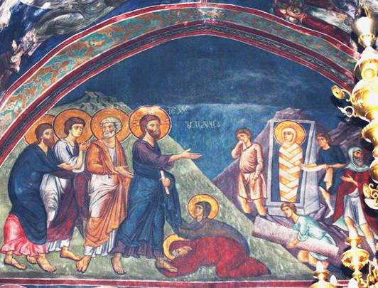 და ვითარცა მოვიდა იესუ ბეთანიად, პოვა იგი, რამეთუ ოთხი დღე აქუნდა საფლავსა შინა. ხოლო იყო ბეთანიაჲ მახლობელ იერუსალჱმსა, ვითარ ათხუთმეტ ოდენ უტევენ. და მრავალნი ჰურიათაგანნი მოსრულ იყვნეს მართაჲსა და მარიამისა, რაჲთა ნუგეშინის-სცენ მათ ძმისა მათისათჳს. ხოლო მართას ვითარცა ესმა, რამეთუ იესუ მოვალს, მიეგებვოდა მას, ხოლო მარიამ სახლსა შინა ჯდა. ჰრქუა მართა იესუს: უფალო, უკუეთუმცა აქა იყავ, არამცა მომკუდარ იყო ძმაჲ იგი ჩემი. არამედ და აწცა უწყი, ვითარმედ: რაჲცა-იგი სთხოო ღმერთსა, მოგცეს შენ ღმერთმან. ჰრქუა მას იესუ: აღდგეს ძმაჲ შენი. ჰრქუა მას მართა: უწყი, რამეთუ აღდგეს აღდგომასა მას უკუანაჲსკნელსა დღესა. ჰრქუა მას იესუ: მე ვარ აღდგომაჲ და ცხორებაჲ. რომელსა ჰრწმენეს ჩემი, მო-ღათუ-კუდეს, ცხონდესვე. და ყოველი რომელი ცოცხალ არს და ჰრწმენეს ჩემი, არა მოკუდეს იგი უკუნისამდე. გრწამსა ესე? ჰრქუა მას მართა: ჰე, უფალო, მრაწამს, რამეთუ შენ ხარ ქრისტე, ძე ღმრთისაჲ, მომავალი სოფლად. და ვითარცა ესე თქუა, წარვიდა და მოუწოდა მარიამს, დასა თჳსსა, იდუმალ და რქუა მას: მოღძუარი მოსრულ არს და გიწესს შენ. ხოლო მას ვითარცა ესმა, აღდგა ადრე და მივიდოდა მისა. რამეთუ არღა მოსრულ იყო იესუ დაბად, არმედ მუნღა იყო ადგილსა მას, სადაცა მიეგებვოდა მას მართა. ხოლო ჰურიანი იგი, რომელნი იყვნეს მისთანა სახლსა შინა და ნუგეშინის-სცემდეს მათ, ვითარცა იხილეს მარიამ, რამეთუ ადრე აღდგა და გამოვიდა, მისდევს მას, ჰგონებდეს, ვითარმედ საფლავად მივალს ტირილდ მისა. ხოლო მარიამ ვითარცა მოვიდა, სადა-იგი იყო იესუ, ვითარცა იხილა იგი, დავარდა ფერჴთა მისთა თანა და ჰრქუა მას: უფალო, უკუეთუმცა აქა ყოფილ იყავ, არამცა მომკუდარ იყო ძმაჲ იგი ჩემი. ხოლო იესუ ვითარცა იხილა იგი, რამეთუ ტიროდა, და მის თანა მოსრულნი იგი ჰურიანიცა ტიროდეს, შეძრწუნდა სულითა, ვითარცა რისხვით, და ჰრქუა მათ: სადა დასდევით იგი? ჰრქუეს მას: მოვედ და იხილე. და ცრემლოოდა იესუცა. იტყოდეს უკუე ჰურიანი იგი: აჰა ვითარ სამე უყვარდა იგი! ვიეთნიმე მათგანნი იტყოდეს: არამცა ეძლო ამას, რომელ მან აღუხილნა თუალნი ბრმასა, ყოფად რაჲმე, რაჲთამცა ესეცა არა მოკუდა? ხოლო იესუ კუალად, ვითარცა განრისხებული თავსა შორის თჳსსა, მოვიდა საფლავსა მას. ხოლო იყო ქუაბი, და ლოდი ზედა ედვა მას. ჰრქუა მათ იესუ: აღიღეთ ლოდი ეგე. ჰრქუა მას მართა, დამან მის მკუდრისამან: უფალო, ყროდისღა, რამეთუ მეოთხე დღე არს. ჰრქუა მას იესუ: არა გარქუ შენ, ვითარმედ, უკუეთუ გრწმენეს, იხილო დიდებაჲ ღმრთისაჲ? აღიღეს უკუე ლოდი იგი, სადა მდებარე იყო მკუდარი იგი. ხოლო იესუ აღიხილნა თუალნი ზეცად და თქუა: მამაო, გმადლ