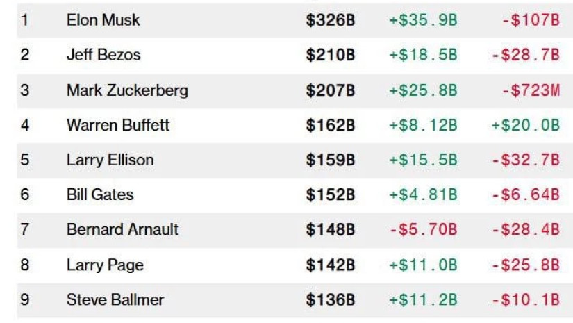 ყველაზე მეტი გამოიმუშავეს ილონ მასკმა (+$35,9 მლრდ), მარკ ცუკერბერგმა (+$25,8 მლრდ) და ჯეფ ბეზოსმა (+$18,5 მლრდ).