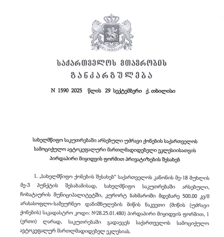 სახელმწიფო ქონების შესახებ” საქართველოს კანონის მე-18 მუხლის მე-3 პუნქტის შესაბამისად, სახელმწიფო საკუთრებაში არსებული, ჩოხატაურის მუნიციპალიტეტში, კურორტ ბახმაროში მდებარე 500 კვ/მ არასასოფლო-სამეურნეო დანიშნულების მიწის ნაკვეთი (მიწის (უძრავი ქონების) საკადასტრო კოდი: N28.25.01.480) პირდაპირი მიყიდვის ფორმით, 1 (ერთ) ლარად, საკუთრებაში გადაეცეს საქართველოს სამოციქულო ავტოკეფალურ მართლმადიდებელ ეკლესიას,” – ნათქვამია განცხადებაში.