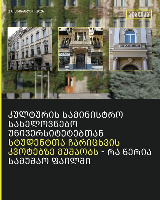„პუბლიკისთვის“ ცნობილი გახდა, რომ ეკონომიკისა და კულტურის სამინისტროები სახელოვნებო უნივერსიტეტებთან ჩასარიცხი სტუდენტების კვოტებთან დაკავშირებულ საკითხზე მუშაობენ.