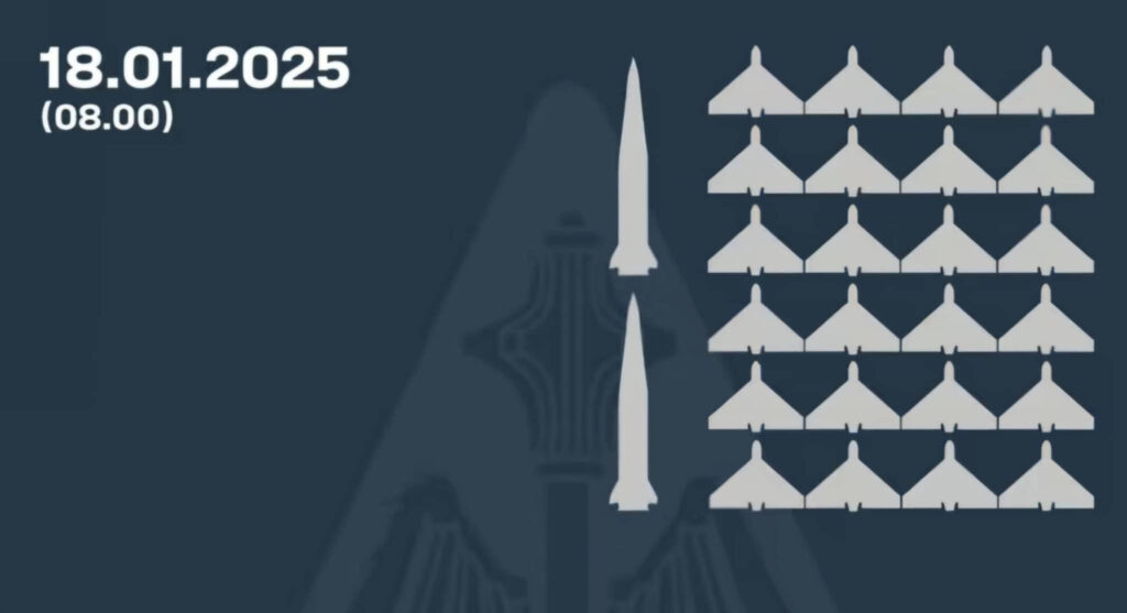 მედია – უკრაინელებმა რუსების მიერ გაშვებული 24 დრონი და 2 ბალისტიკური რაკეტა ჩამოაგდეს
