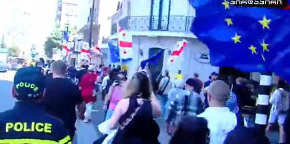 აქციის მონაწილეებს თან აქვთ საქართველოსა და ევროკავშირის დროშები. მსვლელობას მიჰყვება პოლიცია.