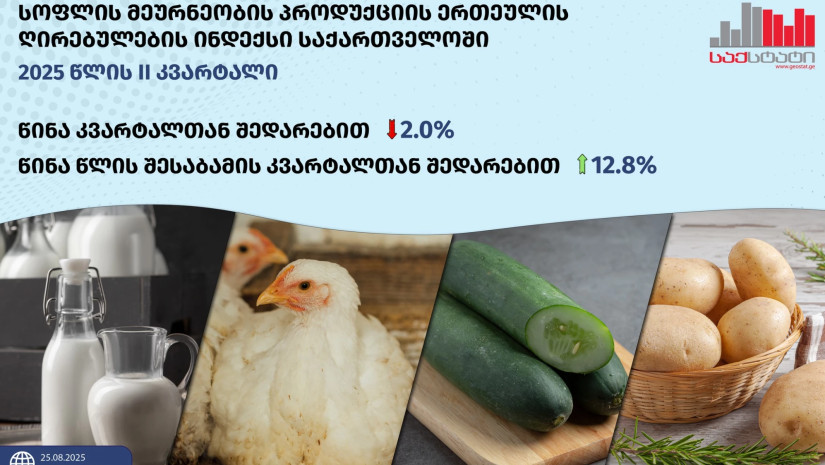 2025 წლის II კვარტალში, სოფლის მეურნეობის პროდუქციის ერთეულის ღირებულების ინდექსი წინა კვარტალთან შედარებით 2.0 პროცენტით შემცირდა. აღნიშნული ცვლილება, ძირითადად, განპირობებული იყო ცოცხალი ცხოველების და ცხოველური წარმოშობის პროდუქტების ღირებულების 7.3 პროცენტიანი კლებით, რამაც -4.08 პროცენტული პუნქტი შეიტანა ჯამური ინდექსის ცვლილებაში.