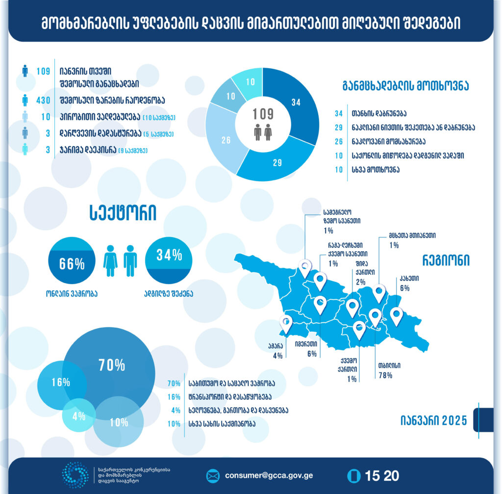 საქართველოს კონკურენციისა და მომხმარებლის დაცვის სააგენტოში (GCCA), 2025 წლის იანვრის თვეში, მომხმარებლის უფლებების დაცვის მიმართულებით, 109 განაცხადი დაფიქსირდა, ხოლო შემოსული ზარების რაოდენობამ 430 შეადგინა.