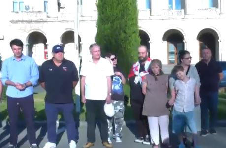 მოქალაქეები გორის საკრებულოს შენობასთან საპროტესტო აქციაზე იკრიბებიან.