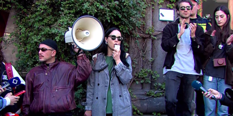 კულტურის სამინისტროსთან ხელოვანების აქცია მიმდინარეობს – ცოტა ხნის წინ ნანკა კალატოზიშვილმა მეგაფონიდან მიმართა თიკა რუხაძეს,
