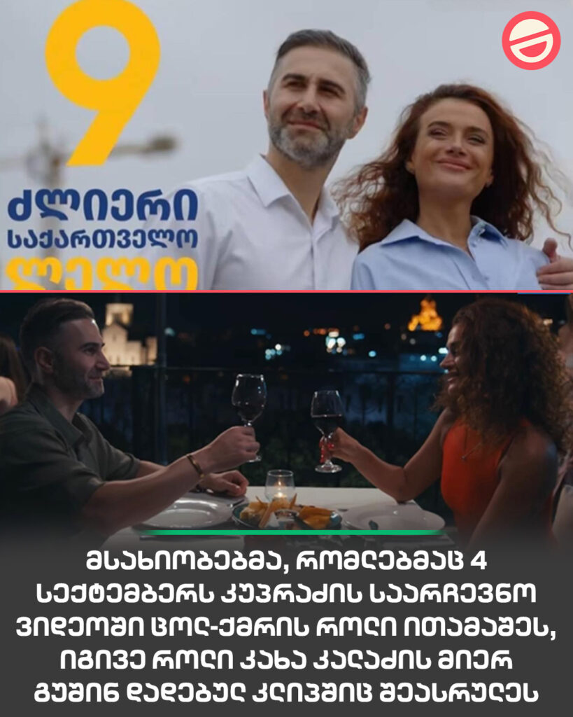 მსახიობებმა, რომლებმაც 4 სექტემბერს ირაკლი კუპრაძის საარჩევნო ვიდეოში ცოლ-ქმრის როლი ითამაშეს, იგივე როლი კახა კალაძის მიერ გუშინ დადებულ კლიპშიც შეასრულეს.