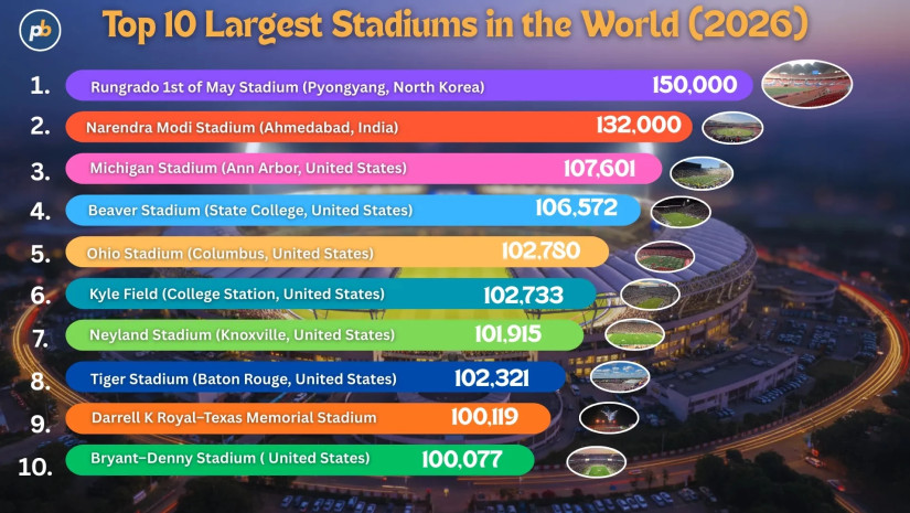 posterbooking-მა მსოფლიოს ყველაზე დიდი სტადიონების რეიტინგი შეადგინა. 2026 წლის რეიტინგში მოცემულია ის ტოპ 10 სტადიონი, რომელთა ტევადობაც 100 ათასს მაყურებელს აჭარბებს.