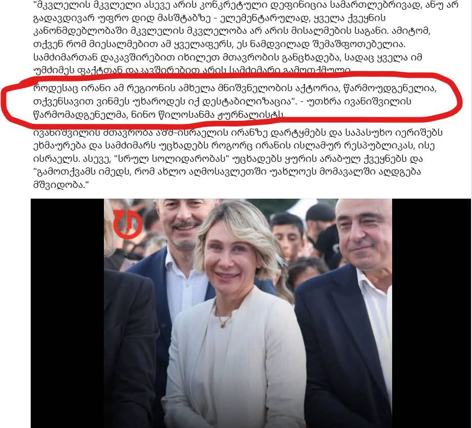არა, ნინო, ირანი რომ აიათოლებისგან თავისუფალი, განვითარებული, ადამიანის უფლებების დაცვაზე ორიენტირებული სახელმწიფო გახდეს და მაგის პერსპექტივა რომ გაჩნდა, ეგ გვიხარია. ირანელებისთვის ხომ უდიდესი ბედნიერება იქნება ეგ და ჩვენთვისაც როგორი ხელსაყრელია, რომ იაზრებდეთ!