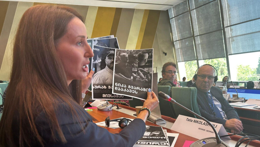 „მე ვარ თათია ნიკოლაშვილი საქართველოდან. მე წარმოვადგენ „ერთიან ნაციონალურ მოძრაობას“, ოპოზიციურ პოლიტიკურ პარტიას. მხოლოდ იმის გამო, რომ მე დღეს აქ ვზივარ მინდა მოგიყვეთ რა ხდება ჩემს ქვეყანაში ახლა – შეიძლება ხვალ, როცა მე ჩავალ საქართველოში, დამაკავონ. აქამდე, მე აქ ჩამოვდიოდი სესიებზე და გიყვებოდით, რომ რუსმა ოლიგარქმა, რომელიც ახლა ჩემს ქვეყანას მართავს, მძევლად აიყვანა ჩვენი ქვეყნის მესამე პრეზიდენტი და ჩვენი პარტიის დამფუძნებელი მიხეილ სააკაშვილი. თუმცა, დღესდღეობით ოლიგარქმა ივანიშვილმა დააპატიმრა ყველა ოპოზიციური პარტიის ლიდერი და თავმჯდომარე. ირაკლი ოქრუაშვილი – ოპოზიციური პარტიის თავმჯდომარე, დაკავებულია. გიორგი ვაშაძე – ოპოზიციური პარტიის თავმჯდომარე, დაკავებულია. ნიკა მელია – ოპოზიციური პარტიის თავმჯდომარე, დაკავებულია. ნიკა გვარამია – ოპოზიციური პარტიის თავმჯდომარე, დაკავებულია. ზურა ჯაფარიძე – ოპოზიციური პარტიის თავმჯდომარე, დაკავებულია. მამუკა ხაზარაძე – ოპოზიციური პარტიის თავმჯდომარე, დაკავებულია. ბადრი ჯაფარიძე – დაკავებულია. გივი თარგამაძე – დაკავებულია. მათ ტყვედ ჰყავთ აყვანილი 50 ზე მეტი ახალგაზრდა, სინდისის პატიმრები, რომლებიც მშვიდობიან აქციებზე დააკავეს. მათ დაატყვევეს ქალი ჟურნალისტი მზია ამაღლობელი. მათ აწამეს, დაასახიჩრეს 400-მდე ახალგაზრდა. მათმა სპეცრაზმმა გაიტაცა და სიკვდილამდე სცემა ჩვენი პარტიის თავმჯდომარე ლევან ხაბეიშვილი.