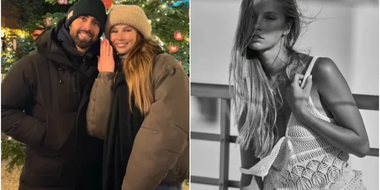 ისინი ნაძვის ხის ფონზე ერთად დგანან, შარლოტა ელენა კი ამაყად აჩვენებს ფოტოგრაფს მის ბეჭედს.