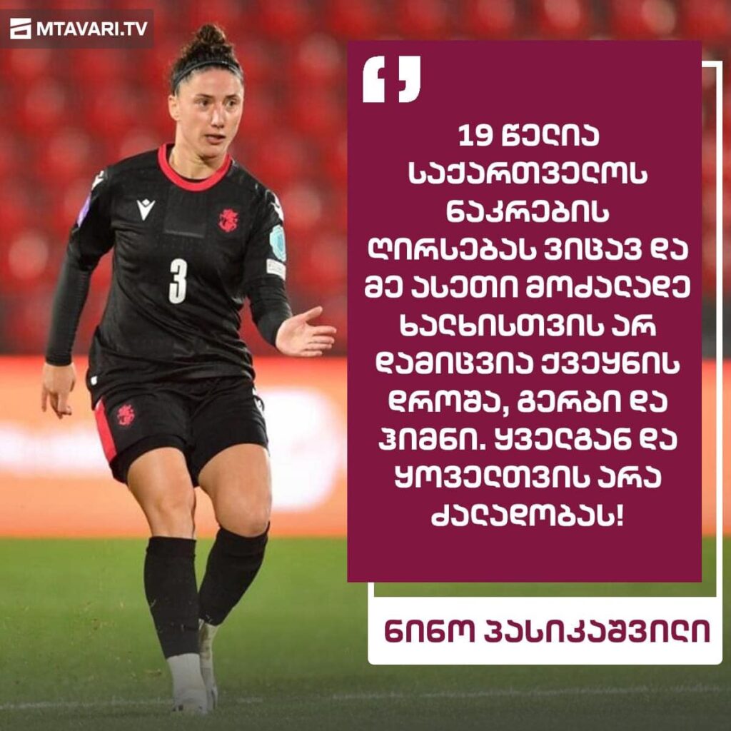 “19 წელია საქართველოს ნაკრების ღირსებას ვიცავ და მე ესეთი მოძალადე ხალხისთვის არ დამიცვია ქვეყნის დროშა, გერბი და ჰიმნი! ყველგან და ყოველთვის არა ძალადობას!” — წერს საქართველოს ქალთა ნაკრების ფეხბურთელი, ნინო პასიკაშვილი.