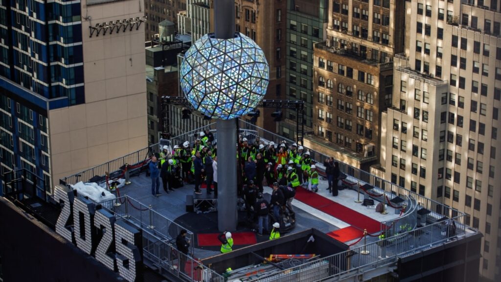 კრისტალებით დაფარული შუშის ბურთი წელსაც ნიუ-იორკში თაიმ სქვერზე ტრადიციულად ღამის 12 საათზე დაეშვება.