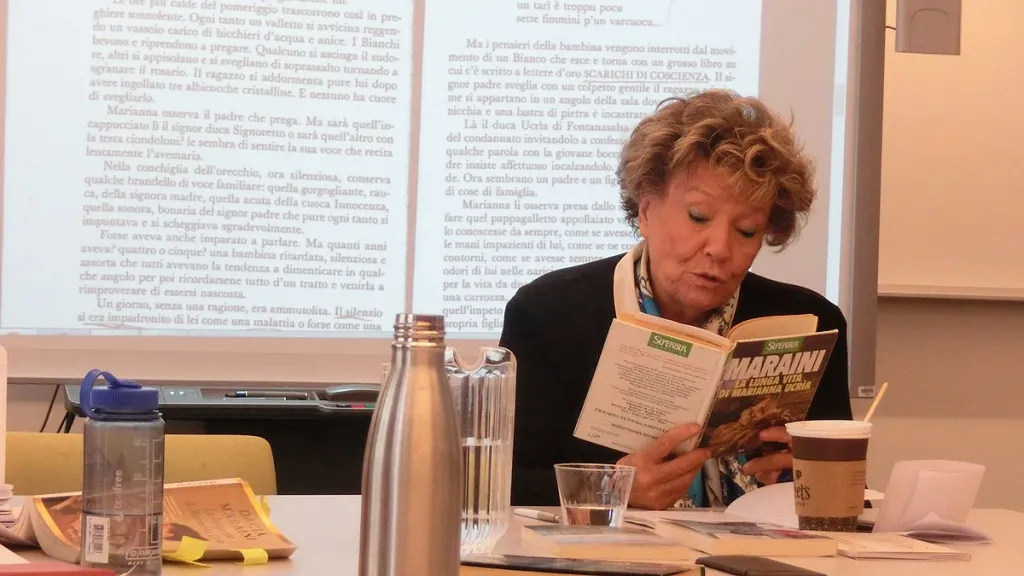 ნუნუ გელაძე: უწინარეს ყოვლისა, ვიტყვი, რომ, ასაკის მიუხედავად, დაჩა ბევრს მოგზაურობს, არა მარტო იტალიაში, არამედ ევროპაშიც, ამერიკაშიც, რადგან მის სიტყვას ათასობით ადამიანი უსმენს, რადგან ცხოვრების მასწავლებელად, სიტყვის ჯადოქრად, იტალიური ლიტერატურის საგანძურად და იტალიური კულტურის ელჩად, ცოცხალ კლასიკოსად მიაჩნიათ. და სამართლიანადაც, ვინაიდან დაჩა მარაინი არის მრავალი ეროვნული და საერთაშორისო პრემიის მფლობელი; იტალიაში და მის ფარგლებს გარეთ მიღებული აქვს დოქტორის რვა საპატიო წოდება (ჰონორის კაუზა); რამდენჯერმე იყო წარდგენილი ნობელის პრემიაზე … შემიძლია უსასრულოდ გავაგრძელო მისი ყველა ჯილდოს, მისი მრავალი წიგნის ჩამოთვლა, სხვათა შორის, თითქმის არ არსებობს დაჩა მარაინის წიგნი, რომელიც 8-10-ჯერ მაინც არ იყოს გამოცემული, ხოლო მისი შედევრი, რომელიც იტალიური ლიტერატურის ძეგლად ითვლება – „მარიანა უკრიას ხანგრძლივი ცხოვრება“ – 73-ჯერ გამოიცა და მილიონი ეგზემპლარი გაიყიდა. დაჩას შემოქმედებაზე იწერება წიგნები, სადიპლომო ნაშრომები, მისი რომანების მიხედვით იღებენ ფილმებს და ა.შ. ასე რომ, მართალს ბრძანებთ, დაჩას მართლაც საინტერესო შემოქმედებითი ბიოგრაფია აქვს, თუმცა, ცხოვრებაც არანაკლებ საინტერესო: 1938 წელს მისი მამა ანთროპოლოგი ფოსკო მარაინი, მთელი ოჯახით იაპონიაში, კერძოდ, ჰოკაიდოში გადაშენების გზაზე მყოფი ქერა და ცისფერთვალება ტომის ჰაინუს (სავარაუდოდ, კავკასიიდან წასული ტომის) შესასწავლად გაემგზავრა. როგორც თავად დაჩა ყვება, ენა იქაურ დიალექტზე ამოიდგა, მთელი ოჯახი (იქ დაბადებული მეორე და მესამე ქალიშვილით) შესანიშნავად იყო ინტეგრირებული იაპონურ გარემოში. მაგრამ 1943 წელს ყველაფერი შეიცვალა, კერძოდ, იტალიასა და გერმანიასთან ალიანსში მყოფმა იაპონიის მთავრობამ ახალგაზრდა წყვილს მოსთხოვა, ხელი მოეწერათ სალოს ფაშისტური რესპუბლიკის მხარდამჭერთა პაქტზე და სასტიკი უარის გამო ანტიფაშისტი ცოლ-ქმარი მცირეწლოვან სამ ქალიშვილთან ერთად ნაგოიას საკონცენტრაციო ბანაკში გაამწესა. უკიდურესი შიმშილის, სიცივისა და დამცირების ორწლიანი ტყვეობა მეორე მსოფლიო ომთან ერთად დასრულდა და ამერიკელების მიერ გათავისუფლებული მარაინების ოჯახი გემით სიცილიაში, დაჩას დედის, ერისმთავარ ალიატების მოშლილ და გაღარიბებულ მამულში, ბაგერიაში დაბრუნდა. ეს ყველაფერი დაჩა მარაინიმ 80 წლის შემდეგ დაწვრილებით აღწერა გასულ წელს გამოცემულ თავის წიგნში „ცხოვრება ჩემი“.