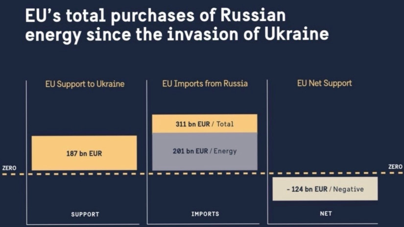 მისი თქმით, ომის განმავლობაში ევროკავშირმა ს ჯამში 187 მილიარდი ევროს დახმარება გამოუყო. იგივე პერიოდში კი ევროკავშირმა სგან 201 მილიარდი ევროს გაზის და ნავთობის იმპორტი განახორციელა, ხოლო ევროკავშირის მთლიანმა იმპორტმა რუსეთიდან 311 მილიარდი ევრო შეადგინა.