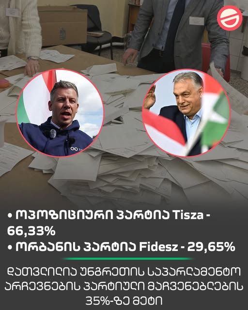 • ოპოზიციური პარტია Tisza – 66,33% • ორბანის პარტია Fidesz – 29,65%