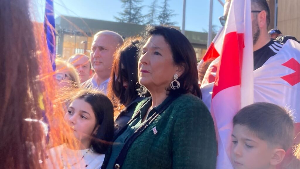 სალომე ზურაბიშვილს მანქანაში ჩაჯდომამდე რამდენიმე წამით ადრე ესვრიან კვერცხებს, შეურაცხყოფას აყენებენ და აგინებენ. რამდენიმე კვერცხი მისი პირადი დაცვის წევრებს მოხვდათ.