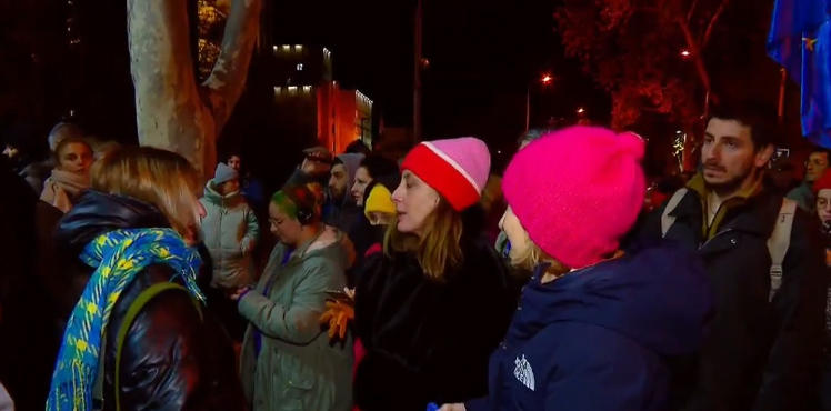 აქცია მიმდინარეობს „ქართული ოცნების“ ოფისთან, სადაც დემონსტრანტები – „მონა, მონას“ სკანდირებენ.