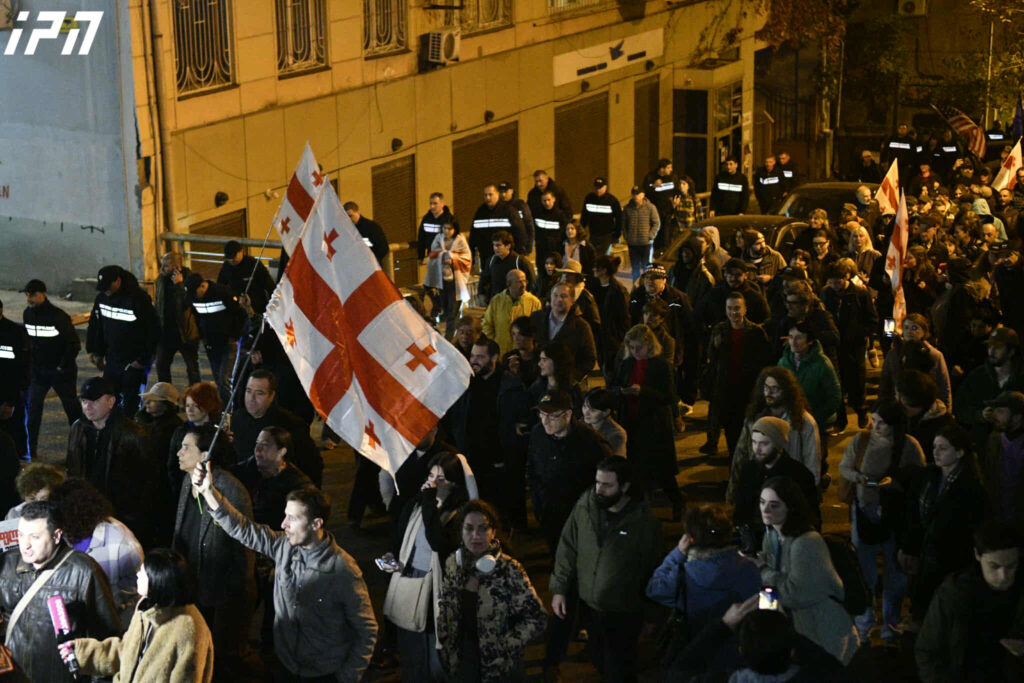 პარლამენტთან შეკრებილი აქციის მონაწილეები მსვლელობას მართავენ.
