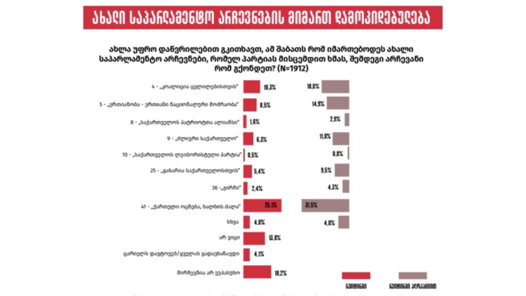 ამასთან, გამოკითხულთა ნახევარზე მეტი (51.3%) აცხადებს, რომ არჩევნებში ხმა ოპოზიციურ პოლიტიკურ ძალას მისცა, ხოლო დაახლოებით მესამედი (32%) ადასტურებს „ქართული ოცნებისთვის” ხმის მიცემას. საკუთარ არჩევანს არ ამჟღავნებს 17%-მდე.