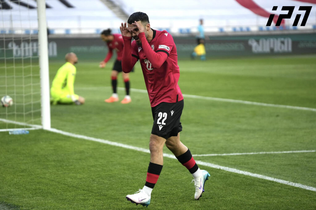 “ერთა ლიგის” “პლეი ოფის” განმეორებითი მატჩის პირველ ტაიმში საქართველოს ეროვნული ნაკრები სომხეთს ანგარიშით 5:0 ამარცხებს. მეხუთე გოლი გიორგი მიქაუტაძემ 35-ე წუთზე გაიტანა.