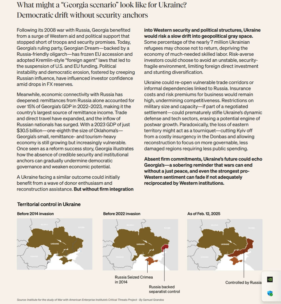 ანგარიში JPMorganChase-ის გეოპოლიტიკის ცენტრმა, Center for Geopolitics-მა, მოამზადა და მასში დეტალურადაა ახსნილი, თუ რას ნიშნავს საქართველოს მსგავსი სცენარი? პოლიტიკურთან ერთად, განხილულია ეკონომიკური და ფინანსური პარამეტრები ორივე ქვეყანაში.