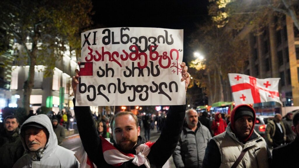 საპროტესტო აქცია რუსთაველზე იმართება მე-11 მოწვევის პარლამენტის პირველი პლენარული სხდომის გასაპროტესტებლად, რომელიც 25 ნოემბერს, დღის 12 საათზეა დაგეგმილი. პოლიციამ 24 ნოემბრის დღის პირველ ნახევარში გაავრცელა განცხადება, რომლითაც დემონსტრანტები გააფრთხილა სისხლის სამართლის პასუხისმგებლობის შესახებ, რომელიც დადგება იმ შემთხვევაში, თუ აქციის გამო საკანონმდებლო ორგანოს ფუნქციონირებას ხელი შეეშლება.