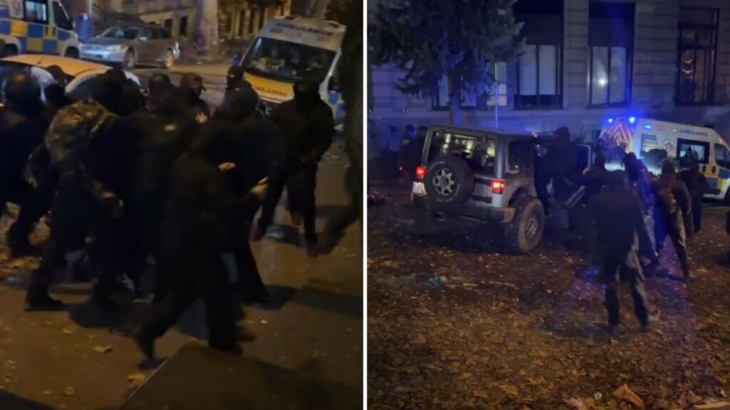 შინაგან საქმეთა სამინისტროს თანამშრომლებმა რუსთაველის გამზირზე, სასტუმრო „თბილისი მარიოტის“ მახლობლად, ავტომობილში, Jeep Wrangler-ში მყოფი სამი პირი გამოათრიეს და ფიზიკურად გაუსწორდნენ.