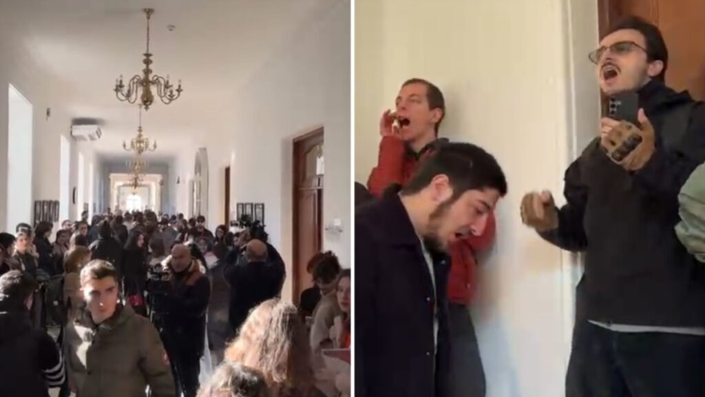 „სირცხვილია, სირცხვილია“, „ცეცხლი ოლიგარქიას“ – სკანდირებენ დემონსტრანტები, მათ შორის სტუდენტები, რომლებიც უნივერსიტეტში იმყოფებიან.