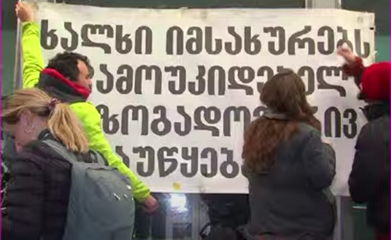 ჩვენი მოთხოვნები იმეორებს ზოგად მოთხოვნებს: გათავისუფლდნენ რეჟიმის ტყვეები და ჩაინიშნოს ხელახალი არჩევნები. ჩვენი მოთხოვნაა ასევე, საზოგადოებრივი მაუწყებლის ეთერში სარედაქციო პოლიტიკაზე პასუხისმგებელმა პირებმა დატოვონ თანამდებობა. და ასევე ვითხოვთ ეთერს, იმ ჟურნალისტებისთვის, რომელსაც კრიტიკული შინაარსის წარმოება შეუძლიათ“, – აცხადებს აქციის მონაწილე.