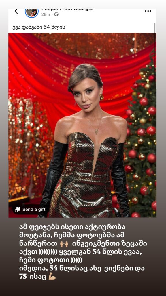 “ამ ფეიჯებს ისეთი აქტიურობა მოუტანა, ჩემმა ფოტოებმა ამ წარწერით, ინგეიჯმენტი ზეცაში აქვთ. ყველგან 54 წლის ევაა, ჩემი ფოტოთი. იმედია, 54 წლისაც ასე ვიქნები და 75 წლის ასაკშიც” -წერს ეკო ფანგანი.