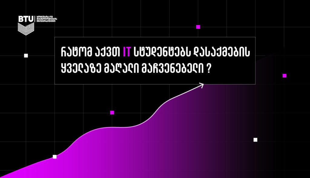 სწორედ ეს გახლავთ მიზეზები, თუ რატომ აქვთ IT სტუდენტებს დასაქმების ყველაზე მაღალი მაჩვენებელი. თუმცა აქვე არ უნდა გამოგრჩეთ ერთ-ერთი მთავარი წინაპირობა. მნიშვნელოვანია საინფორმაციო ტექნოლოგიები ისეთ უნივერსიტეტში შეისწავლოთ, რომელიც ინდუსტრიის თანამედროვე მოთხოვნებს აკმაყოფილებს და სწავლებაც მუდმივად განახლებადი კურიკულუმით ხდება. აუცილებელია, რომ სასწავლო პროგრამა სფეროს განვითარებას ფეხდაფეხ მიჰყვებოდეს. საქართველოში ასეთი უნივერსიტეტი გახლავთ ბიზნესისა და ტექნოლოგიების უნივერსიტეტი, რომელშიც დანერგილია პრაქტიკული მიდგომა პირველი დღიდან.