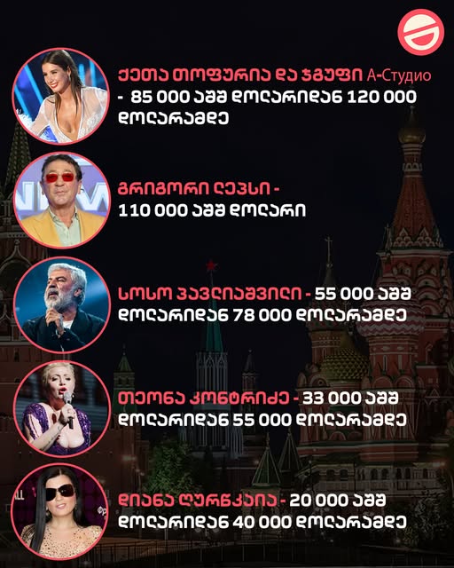 რა ოდენობის ჰონორარს იღებენ საახალწლო კონცერტებში რუსული ესტრადის ქართული წარმოშობის მომღერლები | ინფორმაციას გამოცემა Ambebi. ge რუსულ მედიაზე დაყრდნობით ავრცელებს: