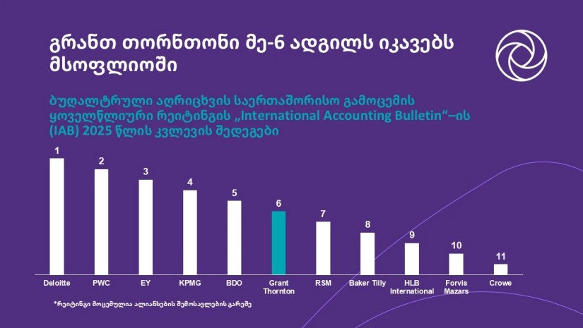 ახლახან გამოქვეყნებულმა ბუღალტრული აღრიცხვის საერთაშორისო გამოცემის ყოველწლიური რეიტინგი „International Accounting Bulletin“–ის (IAB) 2025 წლის კვლევამ კიდევ ერთხელ გაუსვა ხაზი “გრანთ თორნთონის” პოზიციას გლობალურ ასპარეზზე. შთამბეჭდავი, 7.3%-იანი მაჩვენებლით, “გრანთ თორნთონმა” ერთ-ერთი ყველაზე დინამიკური ზრდა აჩვენა თავის მსხვილ კონკურენტებს შორის — რაც ნათლად ასახავს ქსელის მტკიცე სტრატეგიასა და ხარისხზე ორიენტირებულ მიდგომას.