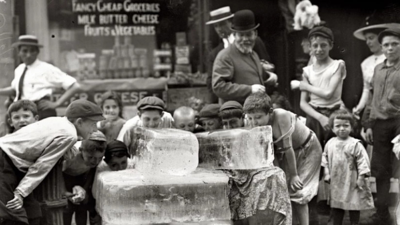 განსაკუთრებით ცხელ დღეებში ქუჩებში უფასო ყინული რიგდებოდა. ნიუ-იორკი, 1900 წ.