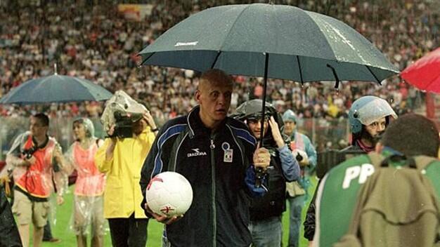 პირველი უგოლო ტაიმის შემდეგ პერუჯაში კოკისპირული წვიმა წამოვიდა, ამინდიც სასწაულისთვის ემზადებოდა. სამსაჯო კოლეგიამ პიერლუიჯი კოლინას ხელმძღვანელობით თამაშის შეწყვეტა გადაწყვიტა. საფეხბურთო ისტორიაში ალბათ ერთერთი საუკეთესო არბიტრი სტადიონზე ქოლგით გავიდა, ბურთი მოედანზე დააგდო, თუმცა მინდორი უკვე იმდენად სველი იყო ბურთი ადგილზე გაქვავდა. თამაში დროებით შეჩერდა. ფეხბურთელებს და ტიფოზებს მატჩის გაგრძელება სურდათ, განსაკუთრებით ამ მხრივ, რა თქმა უნდა, ტურინელთა მხარე გამოირჩეოდა, რომლებსაც ოცნებებში სკუდეტომდე მხოლოდ 45 წუთი აშორებდათ.